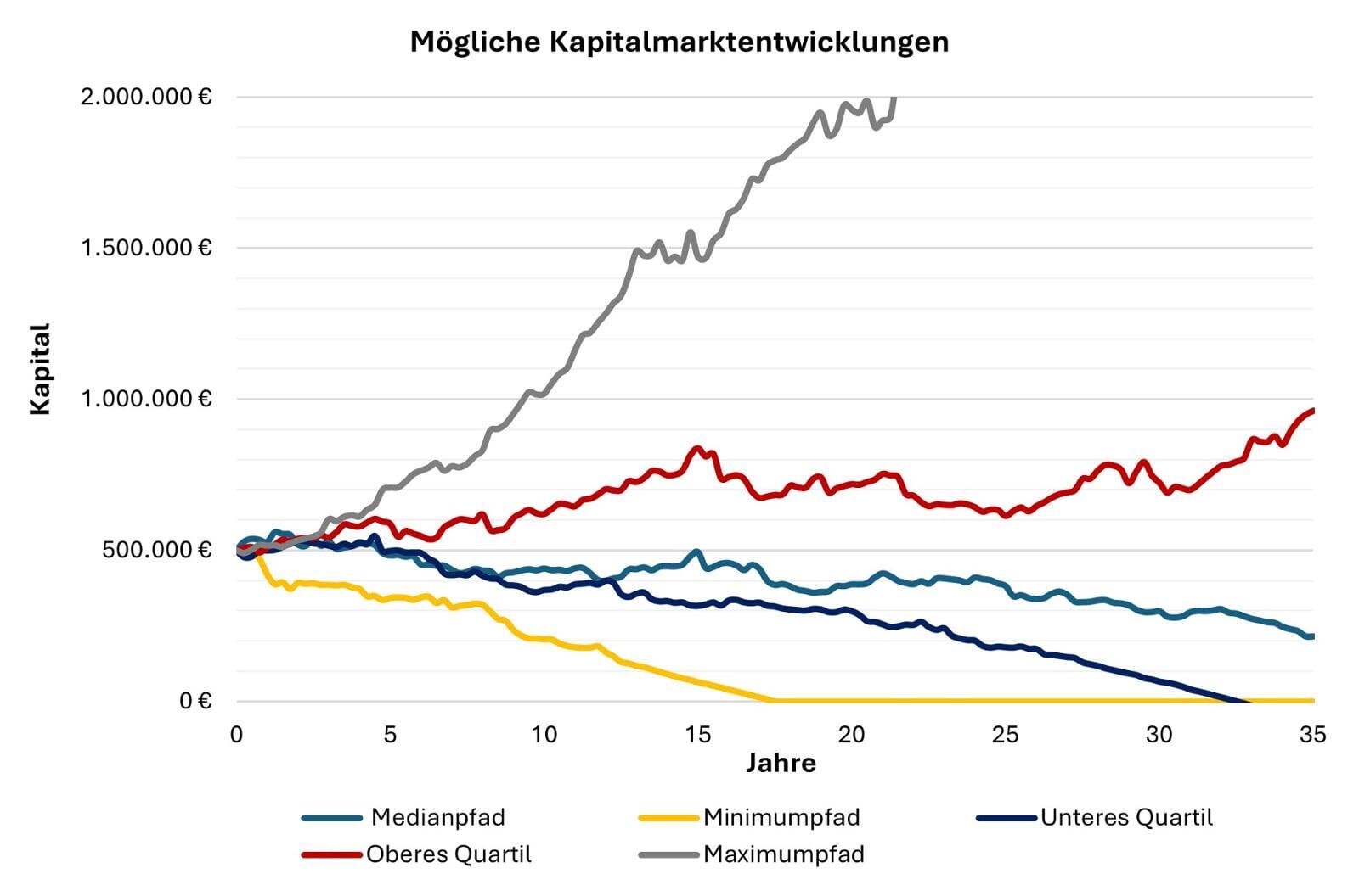 Betrachten wir als Alternative ein ausgewogenes Investment, bei dem die gleiche monatliche Rente aus einem Depot gezahlt wird, das zu gleichen Teilen in Aktien und Anleihen investiert ist. Um die mögliche Kapitalmarktentwicklung realistisch abzubilden, simulieren wir 1.001 unterschiedliche Renditeverläufe über einen Zeitraum von 35 Jahren. Die Grundlage bilden zufällig ausgewählte historische Renditen eines diversifizierten Portfolios aus internationalen Aktien und Anleihen.